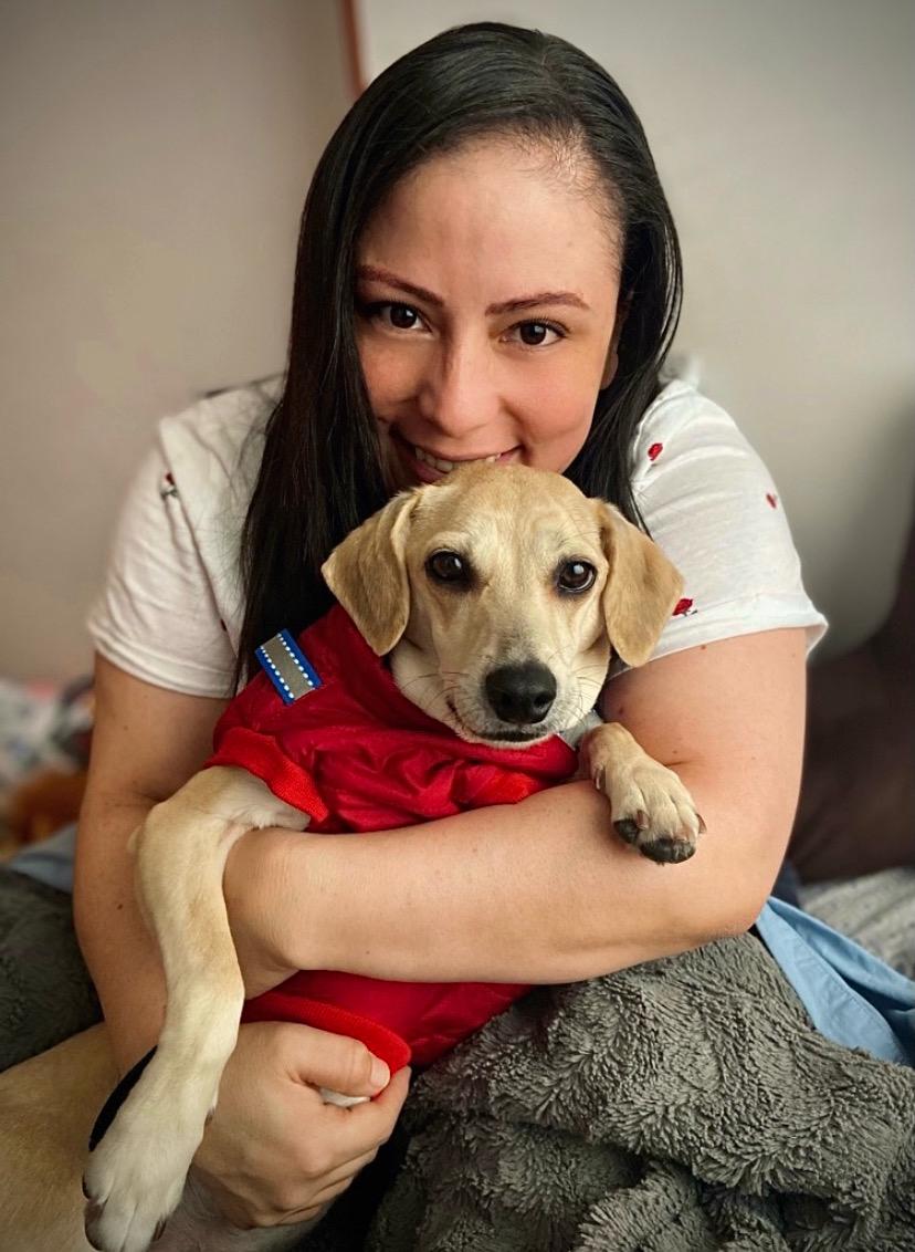 “Samy llegó de Cartagena, luego de que su dueño le pegó un machetazo, y yo la conocí en la Fundación Huella Amiga. Ella estaba en proceso de adopción, pero supongo que por la falta de su manito, no la adoptaron. Entonces yo decidí adoptarla.”